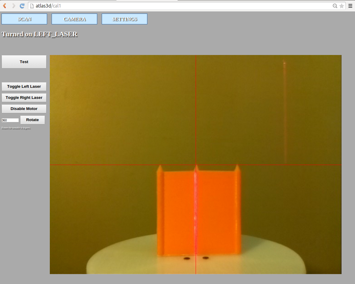 Before scanning for the first time, the hardware must be calibrated. Calibration is the process of moving the lasers and camera to the orientations that the software expects. The Calibration Item Model must be printed and used for the process. Calibration is performed from the Camera page.